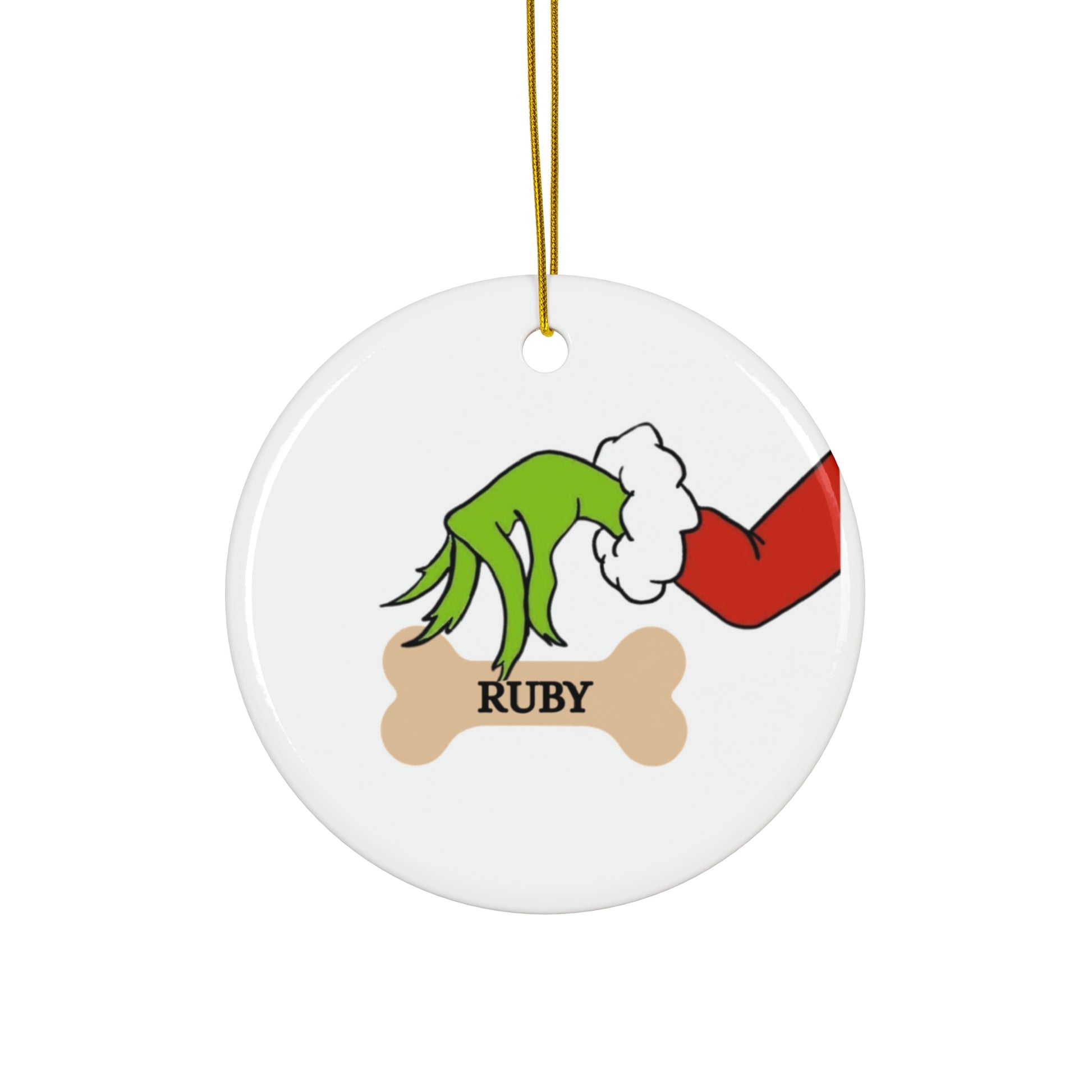A glossy ceramic ornament that brings playful holiday mischief to your tree. The bold, full-color print shows a green, Grinch-like hand snatching a bone labeled with a pet name — a funny, tongue-in-cheek nod to furry troublemakers and their human families. Lightweight but sturdy at 3mm thick, the ornament arrives ready to hang with a gold-toned string threaded through a pre-drilled hole. Choose from snowflake, star, heart, or classic round shapes to match your tree’s personality. The vibrant print and clean white background make the illustration pop, creating a cheerful accent for mantel displays, pet-themed decor, or seasonal stockings.